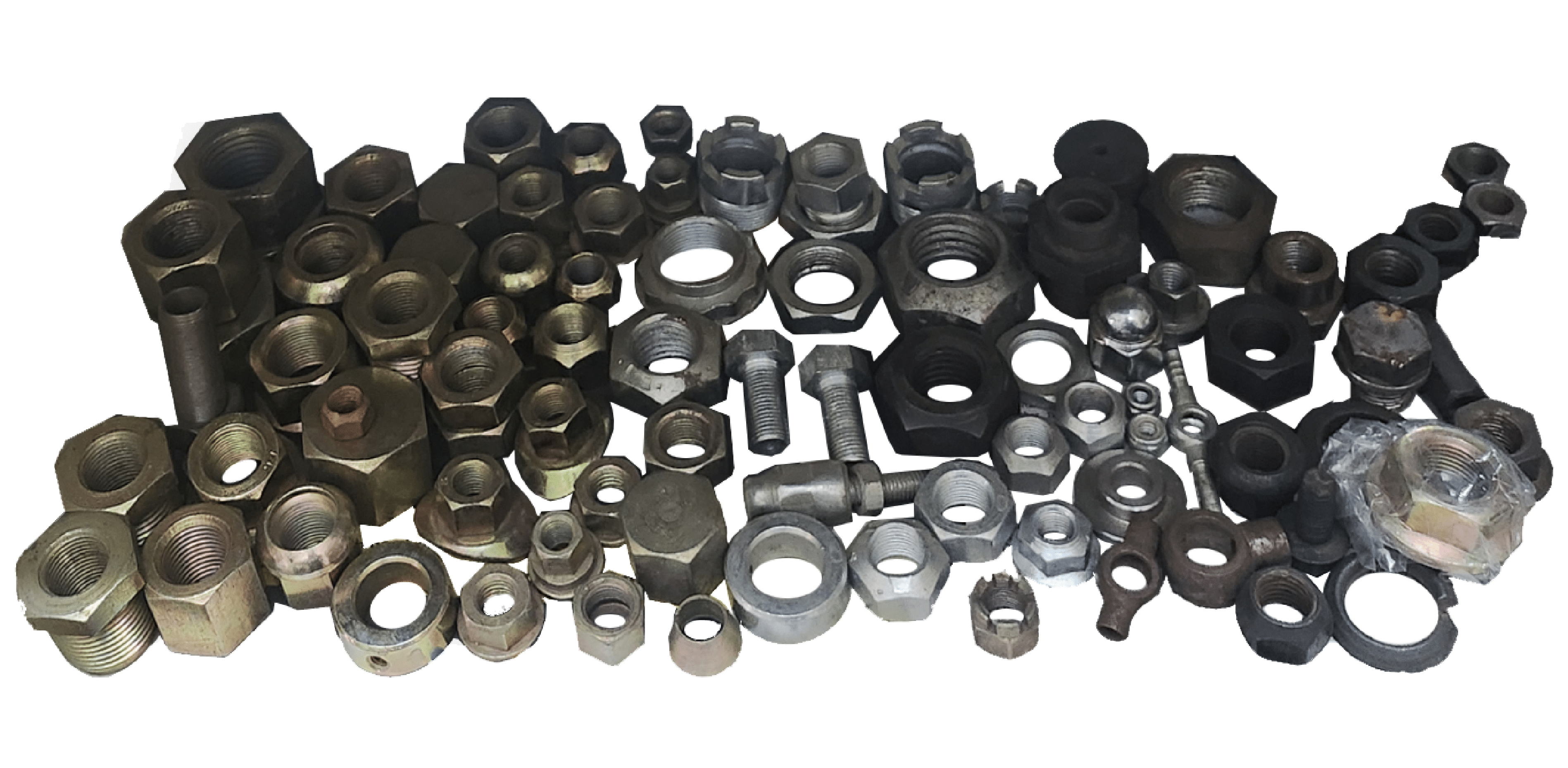 Various types of nuts including hex nuts, lock nuts